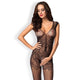 Catsuit en color negro de red formado por top + medias unido en una sola pieza con un espectacular boradado, diseñado por la prestigiosa marca Obsessive.
