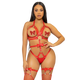 Arnés de cuero vegano con anillas, corazón, cadenitas, correas ajustables y tanga separable.