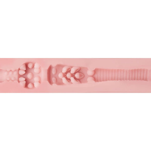 Al entrar, tres pequeños anillos de protuberancias te agarrarán con fuerza, seguidos de la cúpula de placer ultra penetrante que te dará 360 grados de felicidad inigualable. La siguiente cámara comienza con una pequeña fila de dientes y colmillos que te frotan y tiran deliciosamente. Finalmente, una fila de grandes protuberancias conduce a una textura súper acanalada que se estrecha cuanto más se llega al interior.